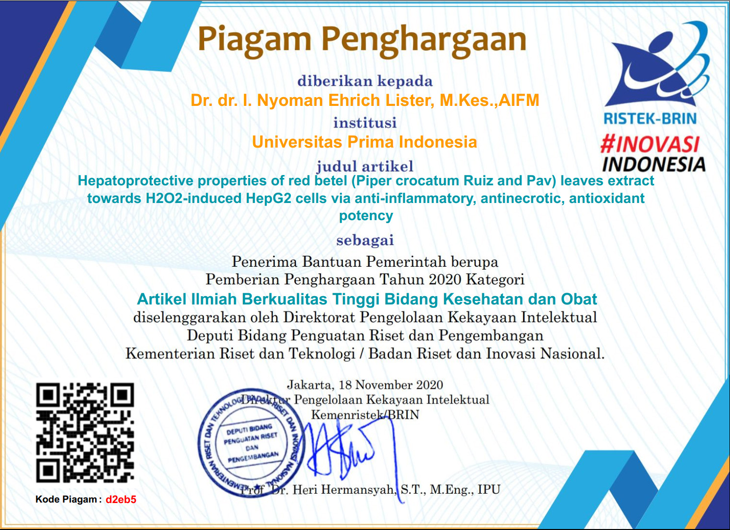 Congratulations to Mr. Dr. Dr. I Nyoman Ehrich Lister, M.Kes., AIFM. Lecturer of the Faculty of Medicine, Prima Indonesia University as a Recipient of Government Assistance in the form of an Award in 2020 in the category of High-Quality Scientific Articles in the Field of Health and Medicine.